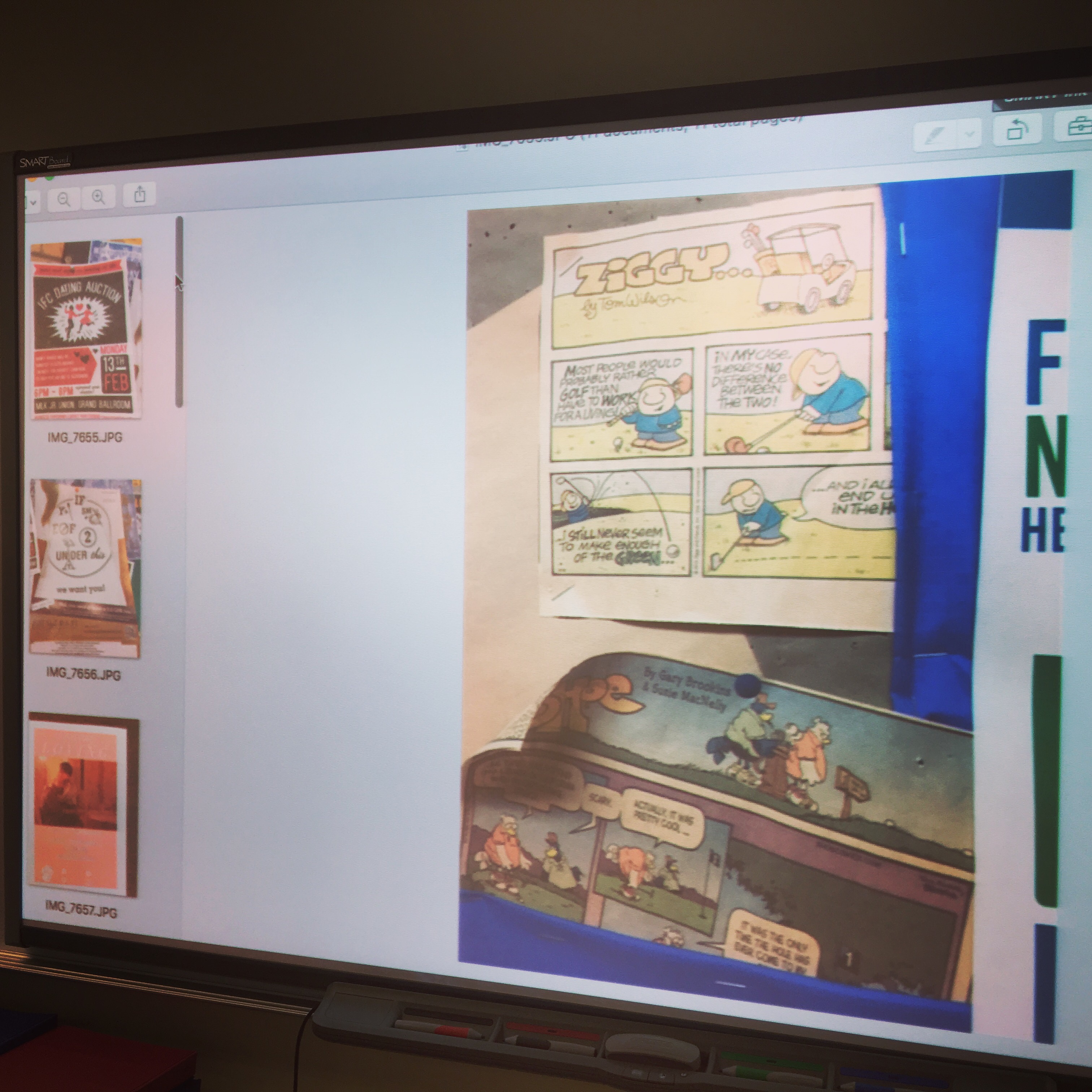 I shared potential stories related to our campus before hearing my students’ ideas in my Advanced Reporting course this morning. In this photo, for instance, students could go around academic buildings to see if profs still post cartoons outside their office. At least one science teacher on campus inserts “The Far Side” strips into assignments. Plus, there were numerous other topics derived from scheduled events that were worthy of further investigation, shown in part in the photo above. Plus, I modeled ways to report mobilely by posting this story and picture from my iPhone.